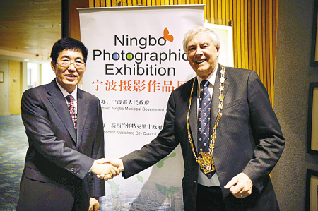 圖為巴音朝魯和哈維市長(zhǎng)在參觀“寧波風(fēng)情”攝影展時(shí)親切握手。(芊峰 攝)