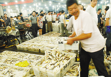 記者在江東水產批發市場看到,帶魚、鯧魚、鰻魚、大小黃魚擺滿了攤頭,交易相當紅火。“個頭比去年的大,品質更好。”多年經營水產的市場負責人戎永敢稱,開漁第一天,由于受臺風“森拉克”影響,我市只有一半漁船出海,因此“第一網”到港時間比往年推遲了一天,但今年第一航次捕獲的魚貨普遍量多貨好,主要品種為帶魚、鯧魚、馬鮫魚等。像野生大黃魚有1公斤重,一下子就被甬城酒店買走。從交易情況看,盡管總體價格變化不大,但部分品種已受到了“開漁第一網”的沖擊,平均批發價格下降了5%-8%。昨晚江東水產市場共成交300噸水產,其中東海水產超過六成多。
