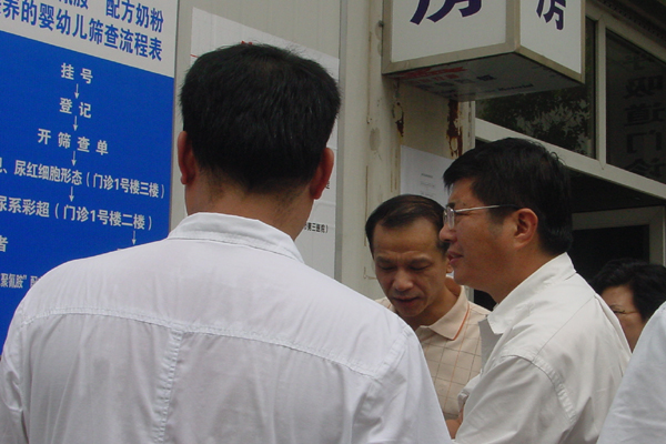 成岳沖來到婦兒醫院開設的專門診區,關切地詢問患兒家長,“哪里來的?”“孩子現在情況怎么樣?”在B超室里,成岳沖把一個小寶寶抱上B超檢查床上,一邊仔細看著B超顯示屏,一邊向家長詢問有關情況。從孩子家長口中得知,孩子已經在西門社區衛生服務中心經過了初步篩查,中心出具了《食用含三聚氰胺嬰幼兒配方奶粉患兒轉診單》,家長就是憑著這張轉診單來到婦兒醫院的。正好,另一臺B超檢查完畢,一位寶寶的家長顯得很開心,“昨天在社區檢查,B超顯示我家小寶寶有很小的小顆粒,今天這里的張醫生給我們小寶寶細細查了,說沒事,這說明我家寶寶安全了。”成岳沖對患兒家長說:“大家都放心,我們一定為所有前來檢查的小朋友進行最細致的檢查,為確診的小寶寶進行最精心的治療。”