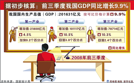 據新華社北京10月20日電 國家統計局新聞發言人李曉超20日說,據初步核算,前三季度國內生產總值201631億元,按可比價格計算,同比增長9.9%,比上年同期回落2.3個百分點。前三季度,我國居民消費價格總水平(CPI)同比上漲7.0%,漲幅比上半年回落0.9個百分點,其中,城市上漲6.7%,農村上漲7.7%。
