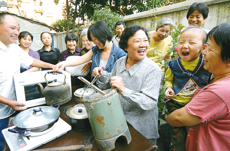 昨天下午,鎮海區招寶山街道城東社區居民李欽娣老人(右四),正在向鄰居們講述過去使用煤球爐的經歷。這幾天,該社區居民正忙著整理煤球爐、煤油爐、火鉗、柴斧、竹瓢、風箱等老廚具,為社區將舉辦的“30年廚房看變化”展覽送上實物展品。 (胡建華 朱 聰 程紅霞 攝)