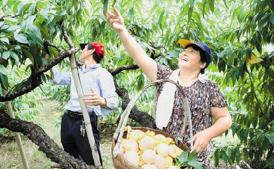 7月17日,在奉化市溪口鎮(zhèn)新建村,農(nóng)戶忙著采摘水蜜桃。奉化水蜜桃今年豐收,口感好,很受消費(fèi)者歡迎。