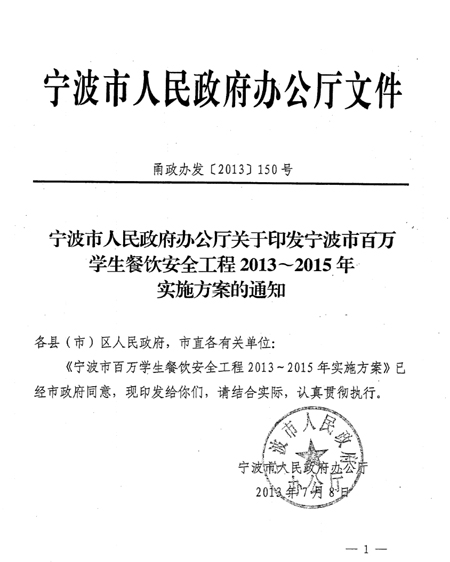 寧波市人民政府辦公廳關于印發寧波市百萬學生餐飲安全工程2013--2015年實施方案的通知