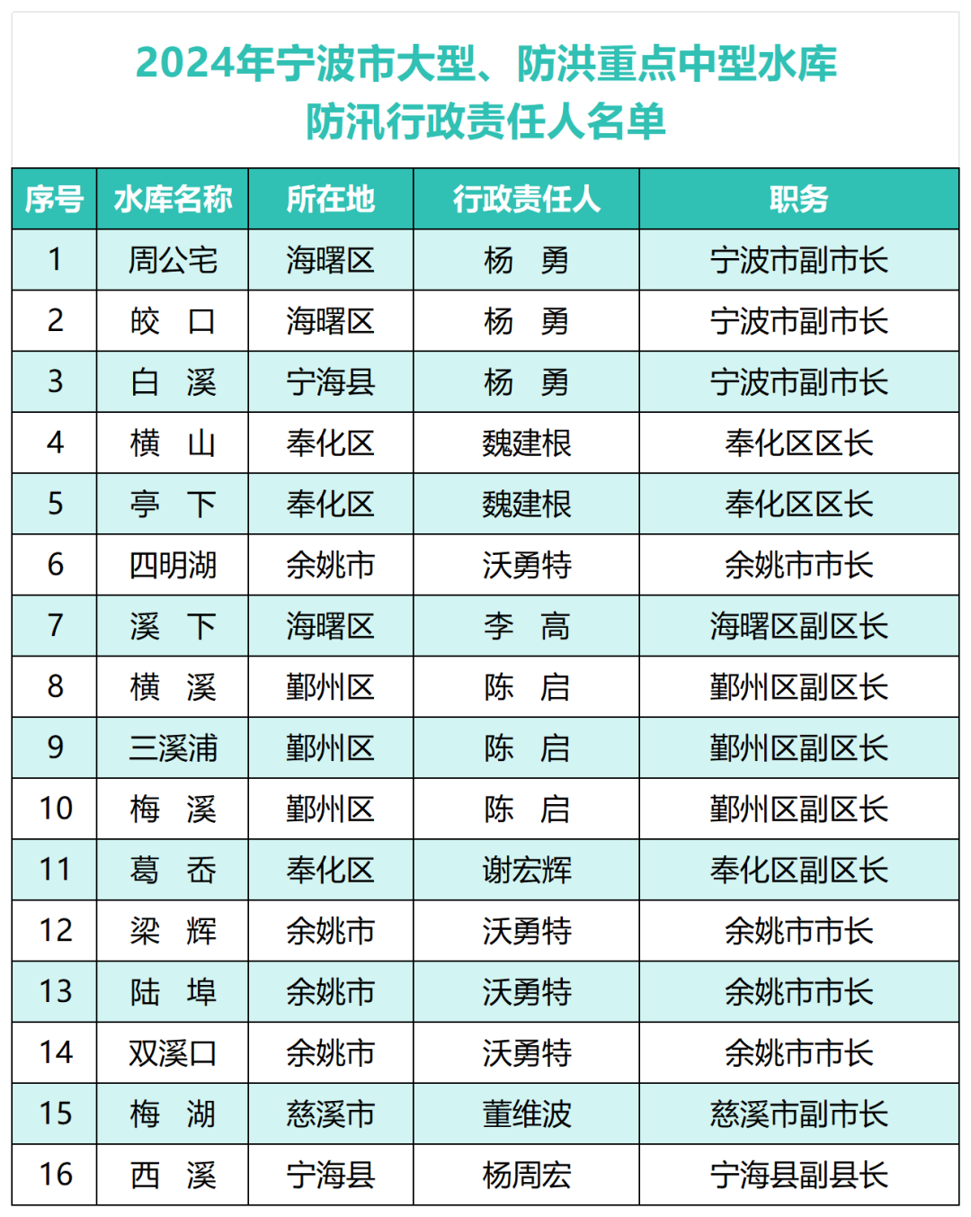 根據《中華人民共和國防洪法》《中華人民共和國抗旱條例》《浙江省防汛防臺抗旱條例》關于防汛抗旱工作實行各級行政首長負責制的規定,現將2024年寧波市-縣-鄉三級防汛防臺抗旱行政責任人及“市領導包縣”“縣領導包鄉”包保責任人名單和大型水庫防洪重點中型水庫防汛行政責任人名單予以公布。