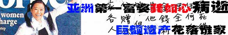 香港華懋集團主席龔如心4月3日在香港養和醫院病逝,享年七十歲。龔如心身前喜愛頭頂紅色蝴蝶結,扎著小辮子,身著迷你短裙,喜歡別人叫她“小甜甜”,因此被人形容為“60歲的年齡,40歲的外貌,20歲的心境”。據估計,持有華懋近90%股份的龔如心,個人財富約為200億至400億港幣,被稱為“亞洲最富有的女人”。[全文]