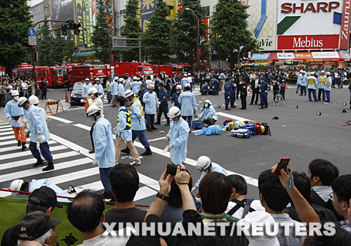 6月8日,警察和醫務人員在日本東京秋葉原電車站附近檢查。 新華社/路透