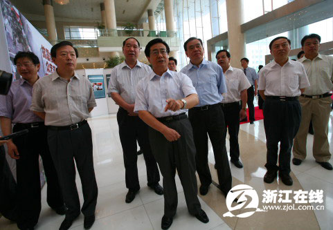 浙江在線6月23日訊(前方記者葉海王堅穎) 8點40分,浙江省委書記、省人大常委會主任趙洪祝,省委副書記、省長呂祖善等領(lǐng)導(dǎo)在參觀完抗震救災(zāi)圖片展之后,會見了抗震救災(zāi)英模事跡報告會一行。