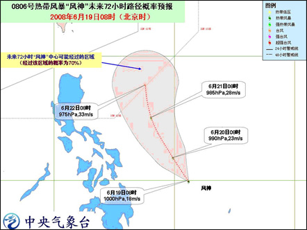 今年第6號熱帶風暴“風神”(FENGSHEN)今天上午在菲律賓以東洋面生成,上午8時風暴中心位于菲律賓馬尼拉東南方向大約1220公里的西北太平洋洋面上,就是北緯9.9度、東經131.2度,中心附近最大風力有8級(18米/秒)。