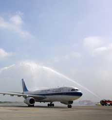 臺北桃園機場用噴水式歡迎廣州首班周末包機