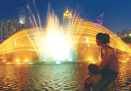 昨晚,市民在流光溢彩的天一廣場噴水池邊納涼。市民切身感受到甬城面貌日新月異,大家的文明素質也越來越高了。(記者周建平攝)
