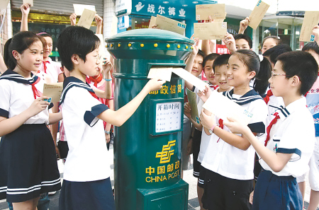昨天,北侖華山小學504班的同學相約給災區的小朋友們寄信。(羅漣浩 陳未鳴 攝)