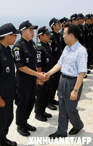 7月29日,韓國(guó)總理韓升洙在獨(dú)島(日本稱“竹島”)上慰問(wèn)執(zhí)行任務(wù)的警務(wù)人員。 新華社/法新