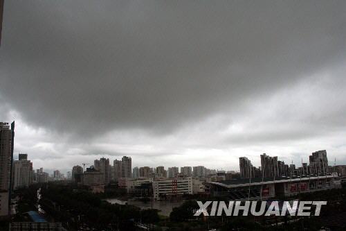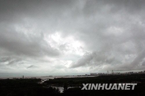 8月6日上午,海口上空烏云滾滾,不時下起大到暴雨。