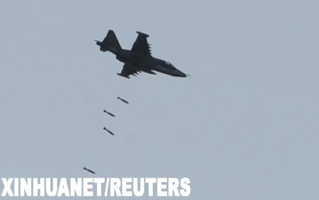 8月8日,一架戰斗機在格魯吉亞南奧塞梯首府茨欣瓦利附近投擲炸彈。新華社/路透