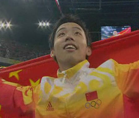 8月16日在國家體育館進行的男子自由體操決賽中,中國選手鄒凱奪得冠軍,圖為鄒凱高舉國旗慶祝比賽勝利。 |