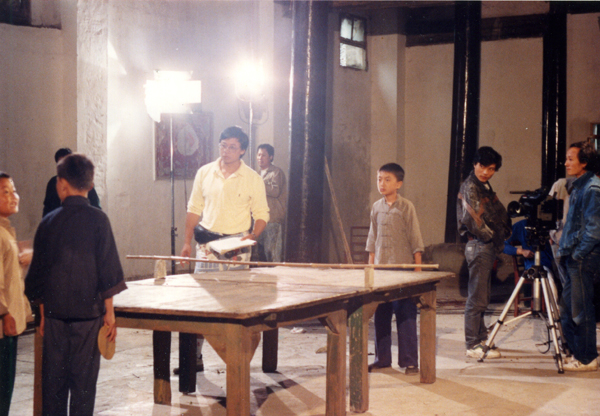 來到了最后面的大禮堂,那時已變了樣,都是忙碌的人。燈光雪亮,完全是舊時的模樣,也不知道他們是在哪里找到的那么破的乒乓臺.開拍有人一聲叫,大家就各就各位了.也有人看了看我.心想這人是那里來的吧,我可是有點怕,有人問起我,我該如何回答。還好沒人來理我.我連忙拿出相機,支好三腳架開始拍了起來。為了不影響攝制組的拍攝,我沒用閃光燈.用光圈F4,速度1/30秒拍了幾張。