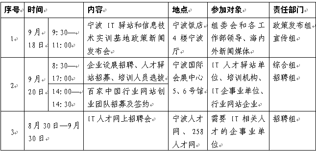 IT服務(wù)外包人才驛站共分四項(xiàng)分體活動(dòng):一是IT服務(wù)外包人才引培現(xiàn)場(chǎng)招募會(huì),組織IT人才驛站單位、培訓(xùn)機(jī)構(gòu)、IT企事業(yè)單位(共30個(gè)標(biāo)準(zhǔn)展位)參會(huì);二是百家中國(guó)行業(yè)網(wǎng)站創(chuàng)業(yè)團(tuán)隊(duì)招募及簽約,發(fā)揮寧波集群行業(yè)經(jīng)濟(jì)和中小企業(yè)眾多的優(yōu)勢(shì),利用中搜行業(yè)中國(guó)平臺(tái),通過(guò)自建行業(yè)供應(yīng)、求購(gòu)、招商、合作等信息發(fā)布功能較為完備的行業(yè)網(wǎng)站,實(shí)現(xiàn)行業(yè)網(wǎng)站與產(chǎn)業(yè)的有機(jī)結(jié)合。通過(guò)行業(yè)域名、辦公用房、中搜行業(yè)中國(guó)平臺(tái)、網(wǎng)站推廣及創(chuàng)業(yè)企業(yè)管理服務(wù)等互聯(lián)網(wǎng)創(chuàng)業(yè)的系列套餐,甄選和動(dòng)員已入駐中搜行業(yè)中國(guó)平臺(tái)的行業(yè)網(wǎng)站及有意創(chuàng)業(yè)的人才落戶寧波,推進(jìn)百家中國(guó)行業(yè)網(wǎng)站企業(yè)落戶寧波工程;三是IT人才網(wǎng)上招聘會(huì),組織市軟件企業(yè)、IT服務(wù)外包企業(yè)、市IT行業(yè)用人單位及需要IT相關(guān)人才的企事業(yè)單位參加;四是IT人才驛站及信息產(chǎn)業(yè)實(shí)訓(xùn)基地政策發(fā)布,主要通過(guò)新聞發(fā)布會(huì)、政策匯編分發(fā)、有關(guān)人才招聘網(wǎng)站等途徑集中發(fā)布寧波市IT人才驛站和信息技術(shù)實(shí)訓(xùn)基地等優(yōu)惠政策。