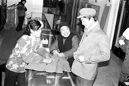 對外開放不斷改變著寧波人傳統的生活方式、風俗習慣,圖為一青年正在商店里試穿西裝。(俞丹樺 攝)