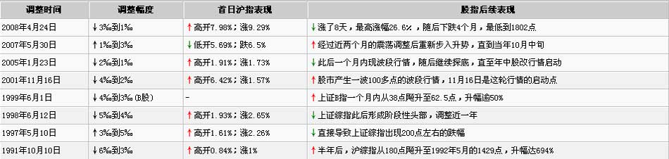 概念:證券交易印花稅是股民從事證券買賣所強制繳納的一筆費用,根據一筆股票交易成交金額計征。 作用:印花稅率的高低可以直接地改變股票的交易成本,因此監管層通過調整印花稅率可以起到調控股市的作用;仡櫍1999年以來,中國證券印花稅率經歷了7次調整。過去只有一次是上調,趨勢是逐步降低,由6‰逐漸降至1‰。 近年最為著名的調整是在2007年5月30日,當日凌晨,財政部決定將現行的1‰印花稅調整為3‰。當天,滬綜指暴跌6.5%,兩市跌停的非ST類個股超過850只。