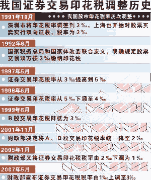 圖為2008年以前我國證券交易印花稅調整歷史。 新華網(wǎng)北京9月18日電(記者韓潔 羅沙)經(jīng)國務院批準,財政部、國家稅務總局決定從2008年9月19日起,調整證券(股票)交易印花稅征收方式,將現(xiàn)行的對買賣、繼承、贈與所書立的A股、B股股權轉讓書據(jù)按1‰的稅率對雙方當事人征收證券(股票)交易印花稅,調整為單邊征稅,即對買賣、繼承、贈與所書立的A股、B股股權轉讓書據(jù)的出讓按1‰的稅率征收證券(股票)交易印花稅,對受讓方不再征稅。 這是繼2008年4月24日下調證券交易印花稅稅率后,中國又一次對該稅率進行大的調整。這也是自1991年以來中國股市首次單邊征收證券交易印花稅。 證券交易印花稅是從普通印花稅發(fā)展而來的,專門針對股票交易發(fā)生額征收的一種稅。證券交易印花稅是政府調控股市的重要工具之一。 過去18年來,中國股市印花稅稅率曾經(jīng)有過數(shù)次調整。 證券交易印花稅自1990年首先在深圳開征,當時主要是為了穩(wěn)定初創(chuàng)的股市及適度調節(jié)炒股收益,由賣出股票者按成交金額的6‰交納。同年11月份,深圳市對股票買方也開征6‰的印花稅,內地雙邊征收印花稅的歷史開始。 1991年10月,深圳市將印花稅稅率調整到3‰,上海也開始對股票買賣實行雙向征收,稅率為3‰。 1992年6月,國家稅務總局和國家體改委聯(lián)合發(fā)文,明確規(guī)定股票交易雙方按3‰繳納印花稅。 1997年5月,證券交易印花稅稅率從3‰提高到5‰。 1998年6月,證券交易印花稅稅率從5‰下調至4‰。 1999年6月,B股交易印花稅稅率降低為3‰。 2001年11月,財政部決定將A、B股交易印花稅稅率統(tǒng)一降至2‰。 2005年1月,財政部又將證券交易印花稅稅率由2‰下調為1‰。 2007年5月30日起,財政部將證券交易印花稅稅率由1‰調整為3‰。 2008年4月24日起,財政部將證券交易印花稅稅率由3‰調整為1‰。 本篇新聞熱門關鍵詞:收益 交易 |