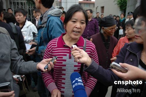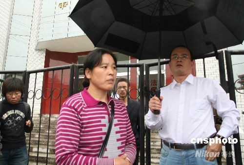九月二十七日,“華南虎照”造假者周正龍因詐騙罪和非法持有彈藥罪在陜西旬陽縣人民法院公開開庭審理,沒有獲準入內旁聽庭審的周妻羅大翠(中)在法庭外等候消息。中新社發程成攝