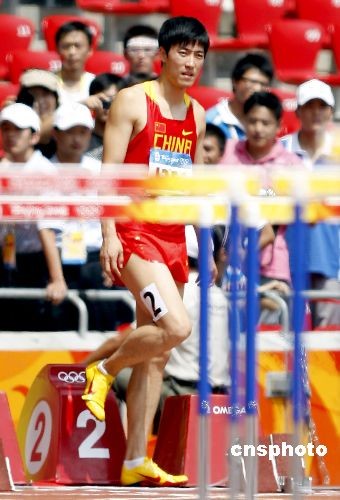 8月18日上午,在北京奧運男子110米欄第1輪第6組比賽中,中國選手劉翔因腿傷遺憾退出比賽。 中新社發 盛佳鵬 攝