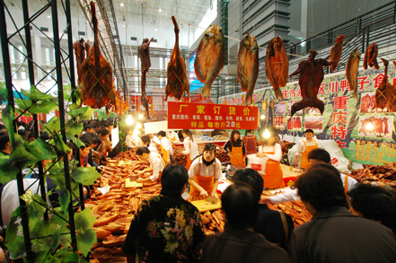 誘人的重慶風味。孫曉青攝 人民網寧波11月9日電 (記者陳偉光、孫曉青) 2007中國食品博覽會今天在寧波舉行。據組委會介紹,寧波在連續三年成為食博會東道主的今天,首次實現了全國各省市區食品產業的“大團圓”。據商務部有關負責人介紹,食博會是商務部在內貿領域重點培育的品牌展會和在全國范圍舉辦的重大商務活動之一,是商務部重點打造的海內外影響大、競爭力強、發展前景好的精品會展之一。本屆食博會以“食品安全與行業和諧發展”為主題,突出人文、安全、創新、品牌、共贏、開放的辦展理念。展會展出面積達到6萬平方米,國際標準展位超過2500個,參展企業超過1800家,展示食品3萬余種。其中,75%以上的參展食品擁有各類馳名、著名、知名商標,“中華老字號”企業有200多家,有30多個民族的特色食品將與市民見面。食博會將安排20多項經貿活動,沃爾瑪、家樂福、麥德龍、大潤發、華潤萬家等海內外大型跨國公司采購團參加食博會。 美國、英國、德國、法國、日本、韓國等20多個國家和地區的客商也將前來參展或采購,海內外參展客商有望達10萬余名,與會人數預計超過30萬人次。 為期四天的2007中國食品博覽會由商務部和浙江省人民政府主辦,國家發展和改革委員會、科技部、農業部、食品藥品監督管理局支持,寧波市人民政府等承辦。