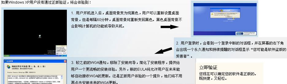 ——Windows正版增值計劃通知(簡稱WGA)和Office正版增值計劃通知(簡稱OGA)。屆時,盜版XP專業版用戶的桌面背景每隔1小時將被成純黑色,盜版Office用戶軟件上將被永久添加視覺標記。國內用戶對微軟“黑屏”的做法反應劇烈。