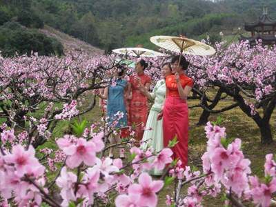 新建漫山的桃花,撐遠了少女們頭頂上藍湛湛的天空,她們信步芳叢展一身虹裝,云胡不喜,奢華不求。