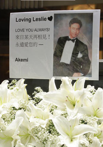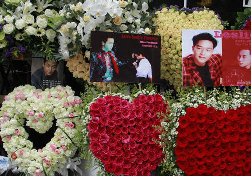 文華酒店外有數(shù)個(gè)心型花圈都是由忠實(shí)哥迷所贈,并在花牌上寫下點(diǎn)滴思念字句,吸引不少市民和游客圍觀,而一些專程由海外來港的哥迷在故地悼念偶像時(shí),亦忍不住淚灑當(dāng)場。