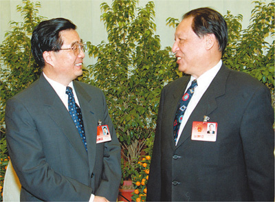 2002年3月8日,胡錦濤同志在北京人民大會堂與成思危同志親切交談。 |