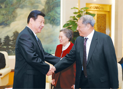 2014年1月22日,習近平等同志在北京人民大會堂同黨外人士歡聚一堂,共迎新春。這是習近平與成思危親切握手。 |