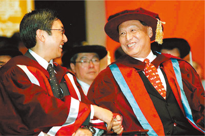 2000年11月23日,在香港理工大學舉行的第六屆畢業典禮上,成思危(右)被授予榮譽工商管理博士學位。 TD> |