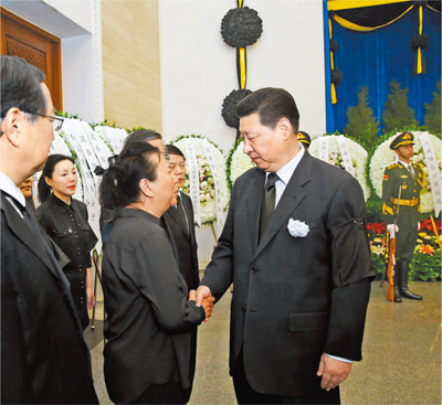 7月22日,萬(wàn)里同志遺體在北京八寶山革命公墓火化。習(xí)近平、李克強(qiáng)、張德江、劉云山、王岐山、張高麗、胡錦濤等前往八寶山送別,江澤民在外地送花圈表示哀悼。這是習(xí)近平與萬(wàn)里親屬握手,表示深切慰問(wèn)。 |